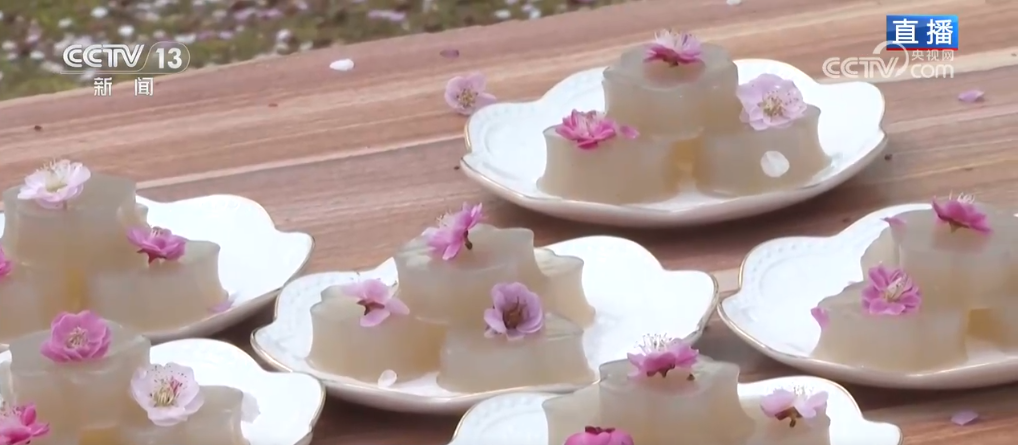 這個季節(jié)來到芳院村,與賞花踏青最搭配的就是圍爐煮茶了。芳院村的茶也非常特別,叫做“蛋茶”。就把煮開的茶水沖入均勻攪拌的蛋液中,然后再加上冰糖,這就是“蛋茶”。每當村里誰家辦大事、干重活的時候,村民們都會泡蛋茶來接待,這也是當?shù)氐拇褪锥Y。在芳院村,這個季節(jié)還有一個春日限定美食,就是梅花糕。它主要的原材料是當?shù)氐牡毓戏?,關鍵在于用了梅花花瓣熬出來的汁。梅花糕不僅形似梅花,而且入口甜糯、味道清雅,這些也是芳院村正在打造的“花樣”經(jīng)濟。近年來,當?shù)卦诒Wo傳統(tǒng)村落的基礎上,以花為“媒”培育“花樣”經(jīng)濟,吸引游客前來賞花打卡,帶動村集體和村民雙增收。