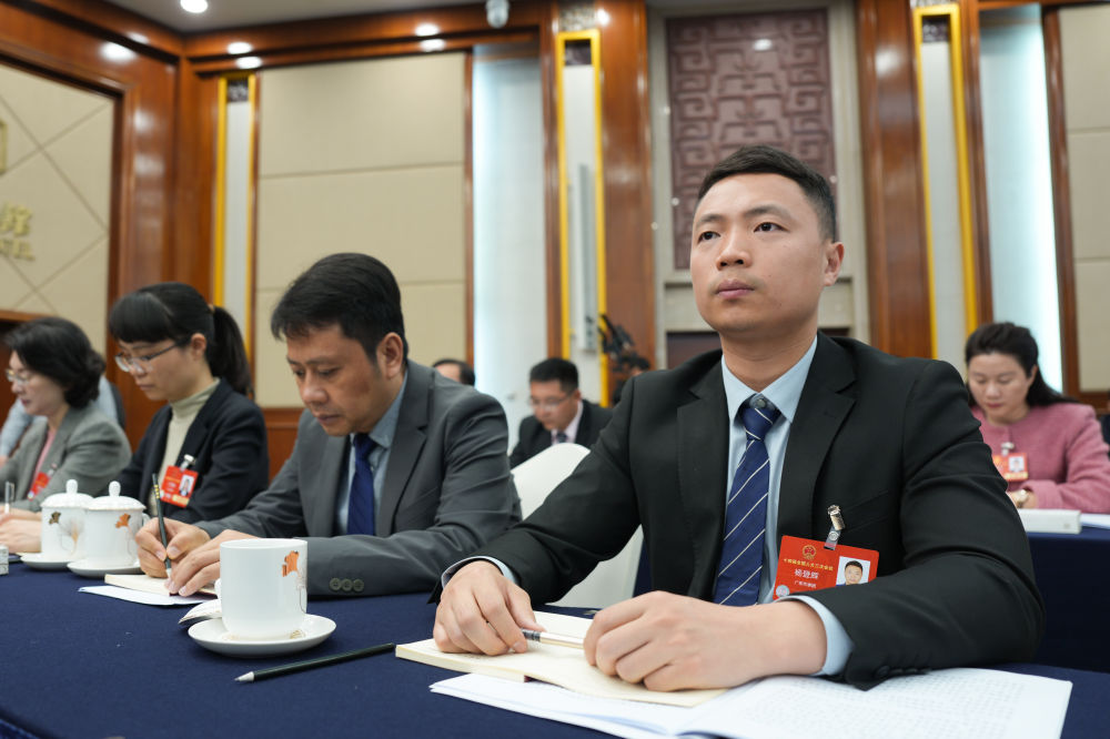 楊登輝(前右一)在十四屆全國人大三次會(huì)議廣東代表團(tuán)全體會(huì)議上認(rèn)真聽取發(fā)言。