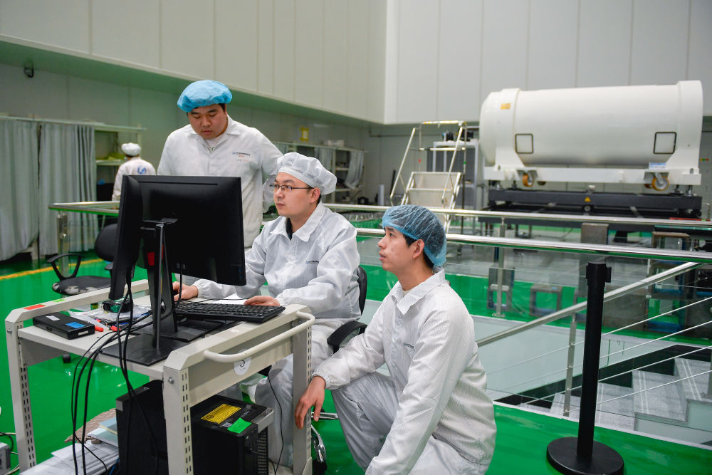 在長光衛(wèi)星相機(jī)裝調(diào)間,王升(右二)在調(diào)試衛(wèi)星光學(xué)遙感載荷組件時(shí)與團(tuán)隊(duì)成員討論細(xì)節(jié)。