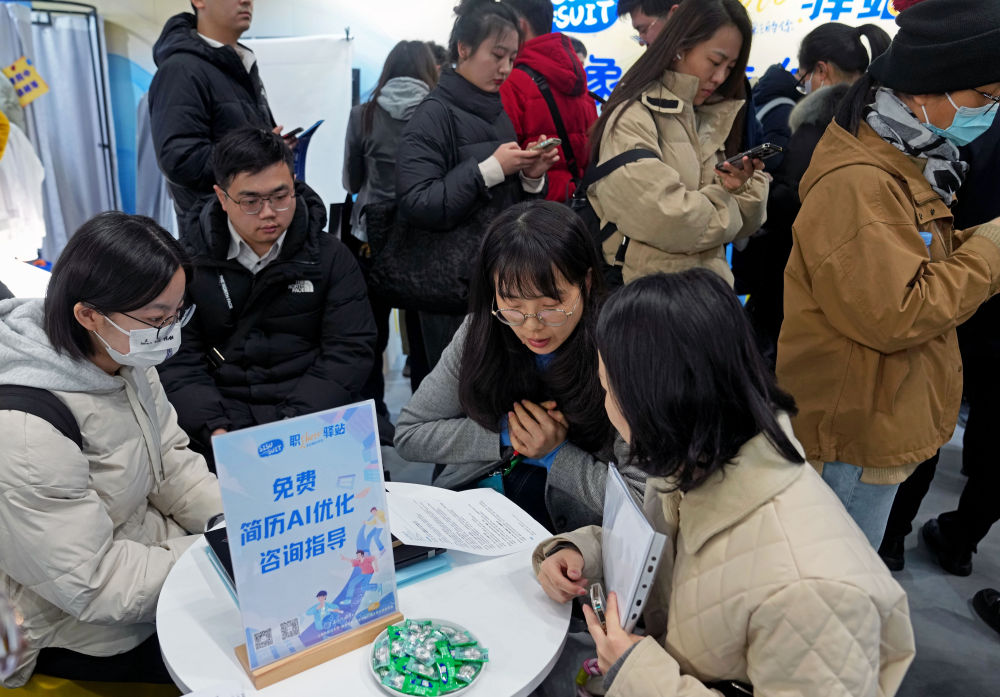 在上海一個(gè)大型招聘會(huì)現(xiàn)場,工作室團(tuán)隊(duì)為求職者進(jìn)行簡歷優(yōu)化指導(dǎo)。