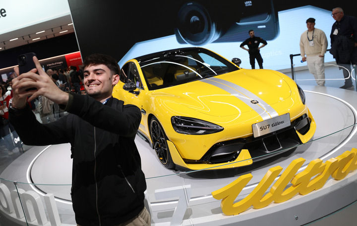 2025年3月6日,在西班牙巴塞羅那舉行的2025年世界移動通信大會上,一名男子和小米汽車合影。新華社記者 趙丁喆 攝
