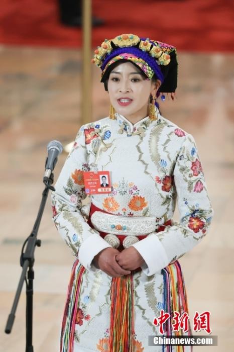 全國(guó)人大代表、四川省馬爾康市養(yǎng)護(hù)院院長(zhǎng)格西王姆接受采訪。中新社記者 富田 攝