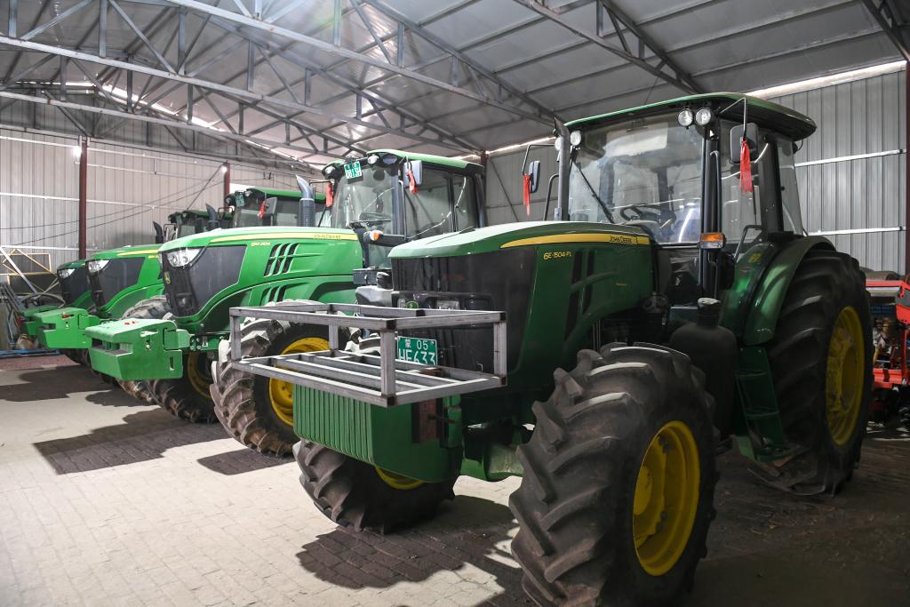 兩臺嶄新的拖拉機僅車轱轆就一人多高。陳胡日查說,這種拖拉機省油、效率高,一天能種300多畝地。