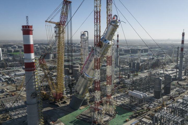 2月26日拍攝的華錦阿美精細(xì)化工及原料工程項(xiàng)目芳烴聯(lián)合裝置抽余液塔吊裝施工現(xiàn)場(無人機(jī)照片)。 新華社記者 潘昱龍 攝