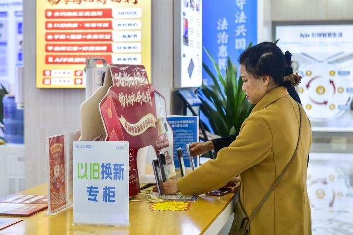 2月21日,在廣西東興市一家手機(jī)賣場,消費(fèi)者在查看手機(jī)以舊換新的機(jī)型。新華社記者 曹祎銘 攝
