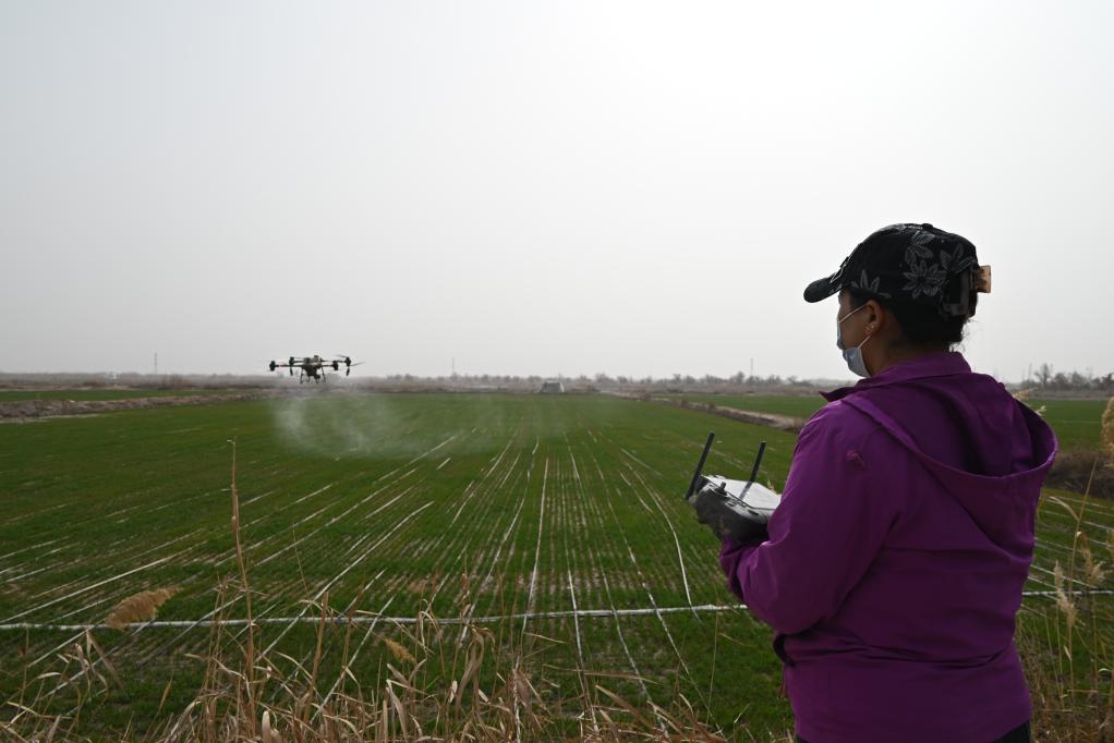 3月18日,在新疆喀什地區(qū)英吉沙縣一麥田,努日曼古麗正在操作無(wú)人機(jī)。新華社記者 尹茹紅 攝