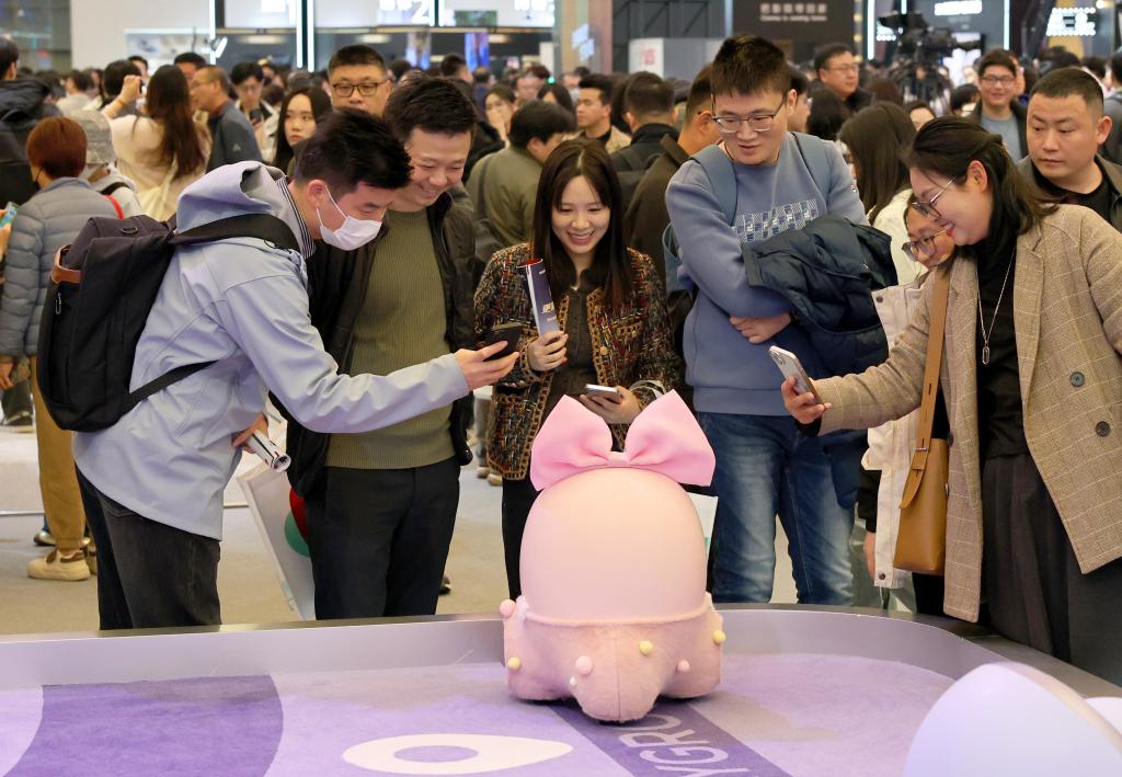 3月20日,參觀者在展會上與“Ai Me智能機(jī)器人”互動。當(dāng)日,以“AI科技、AI生活”為主題的2025中國家電及消費電子博覽會(AWE2025)在上海新國際博覽中心開幕。本屆展會吸引全球千余家企業(yè)參展,全景展示家電及消費電子領(lǐng)域的前沿成果,呈現(xiàn)AI賦能智慧生活的新產(chǎn)品、新方案、新場景。(新華社記者 方喆 攝)