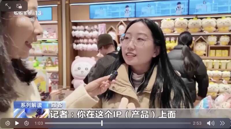 北京朝陽區(qū)的一家IP聯(lián)名店,可以看到首發(fā)、首秀的國產(chǎn)周邊衍生品。截圖來自央視新聞