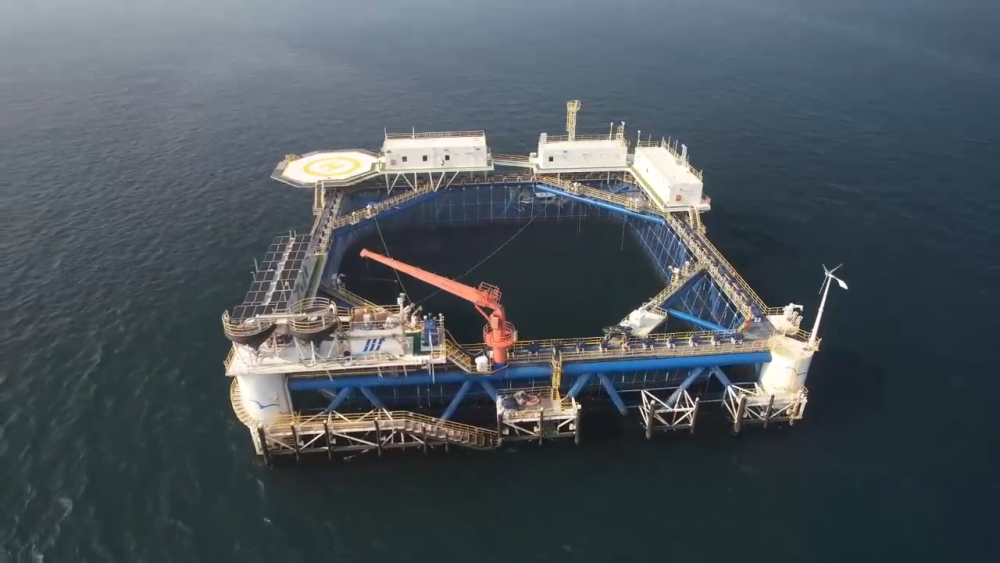 在距離大陸岸線42海里的海域坐落著這樣的深遠海智能網(wǎng)箱平臺,網(wǎng)箱長寬均為68米,布設(shè)500個監(jiān)測點,配備了聲納、激光雷達等設(shè)備。這樣的1個網(wǎng)箱每年能產(chǎn)出100萬條魚,只需要4個工人來操作。