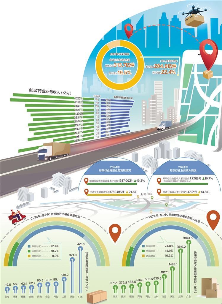 跨越式發(fā)展背后也是超大規(guī)模市場(chǎng)的有力支撐。去年全國(guó)網(wǎng)上零售額增長(zhǎng)7.2%,連續(xù)12年成為全球最大網(wǎng)絡(luò)零售市場(chǎng),這為快遞業(yè)發(fā)展提供了廣闊空間。從區(qū)域結(jié)構(gòu)看,去年以來(lái),行業(yè)企業(yè)積極破解新疆、內(nèi)蒙古等地“不包郵”問(wèn)題,有力激發(fā)中西部地區(qū)消費(fèi)潛力。2024年,中部、西部快遞業(yè)務(wù)量同比增長(zhǎng)30%、35%,成為支撐快遞規(guī)模增長(zhǎng)的新引擎。
