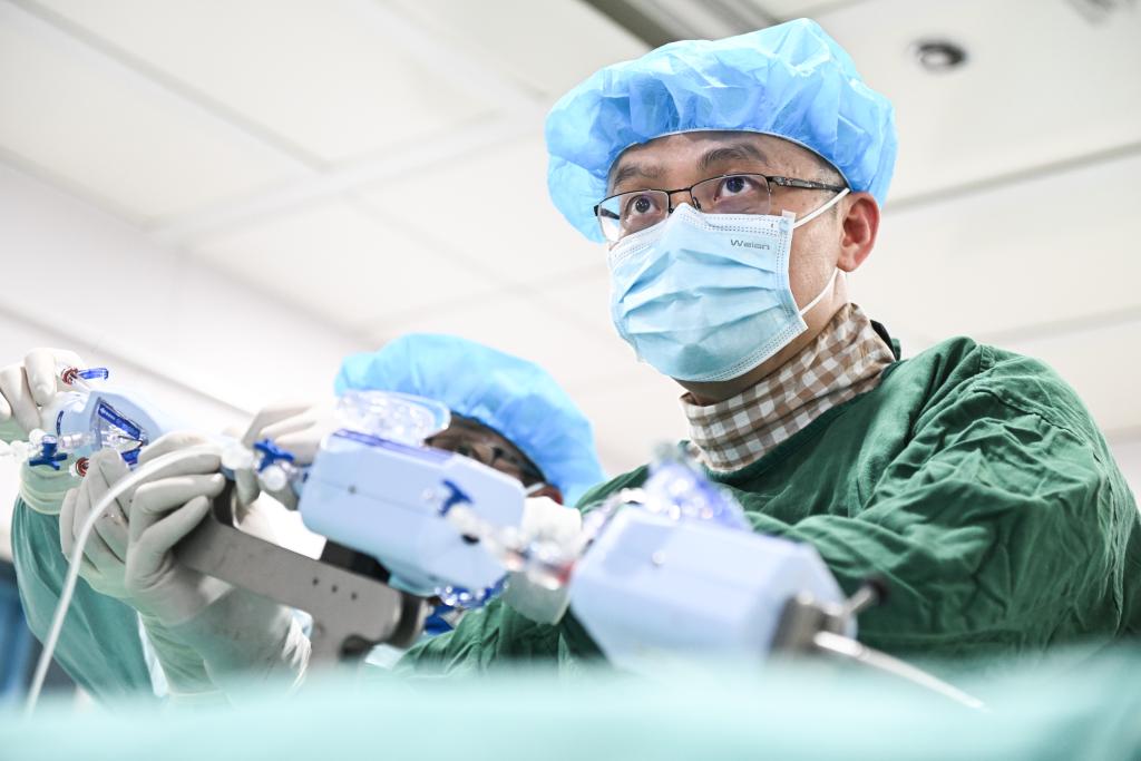 2月20日,在南京市第一醫(yī)院,張俊杰和團隊在心導(dǎo)管室為患者進(jìn)行經(jīng)導(dǎo)管二尖瓣緣對緣修復(fù)手術(shù)。(新華社記者 季春鵬 攝)