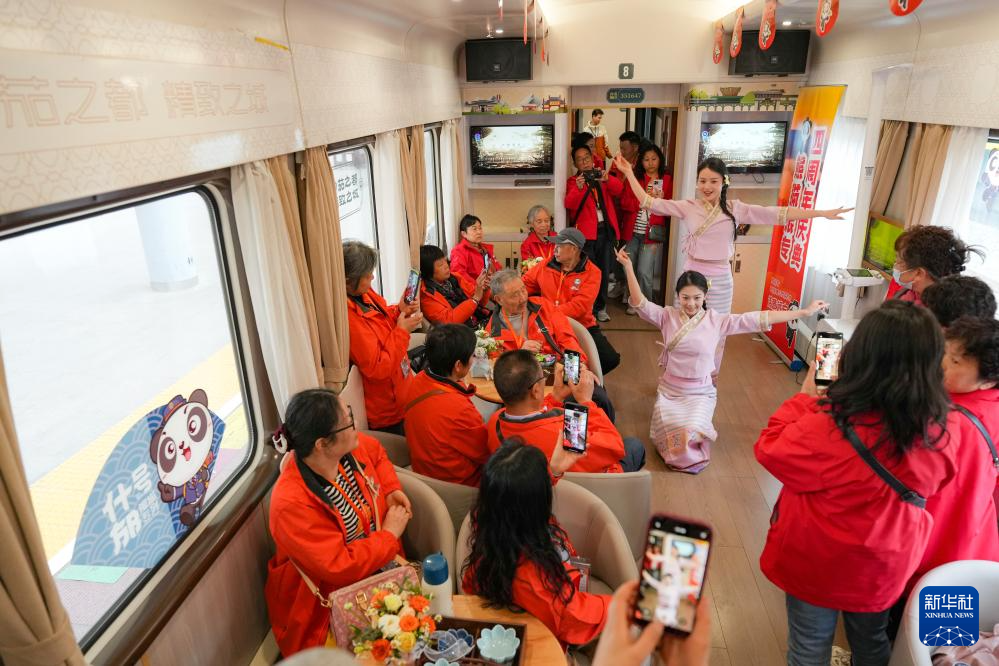 3月28日,在Y471次“熊貓專列·什邡號(hào)”列車上,旅客們?cè)谟^看云南民族舞蹈表演。