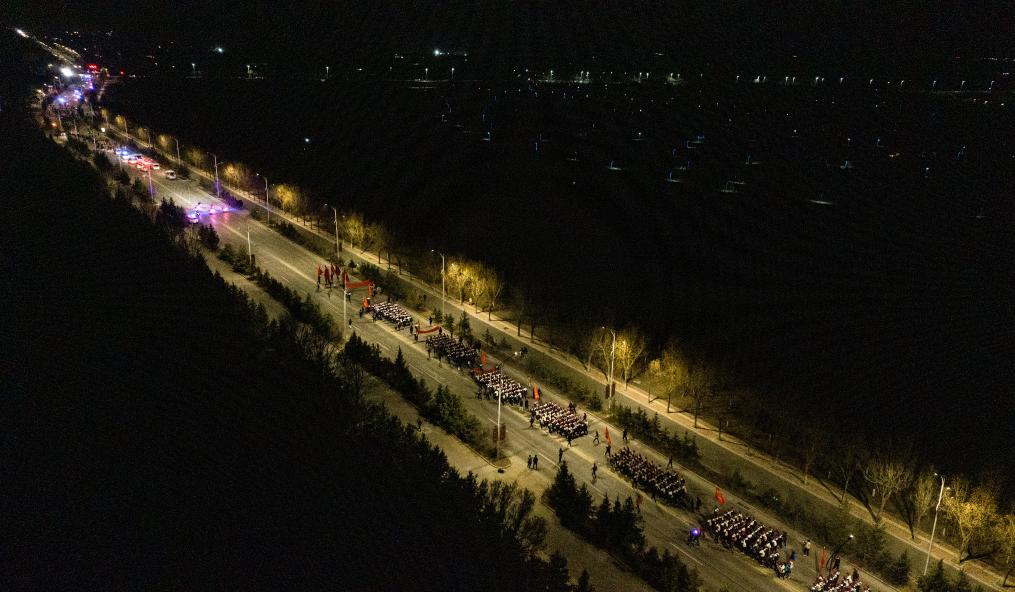 4月3日凌晨,參加徒步祭英烈活動的師生從固原市城區(qū)出發(fā),前往位于彭陽縣的任山河烈士陵園祭奠英烈(無人機(jī)照片)。