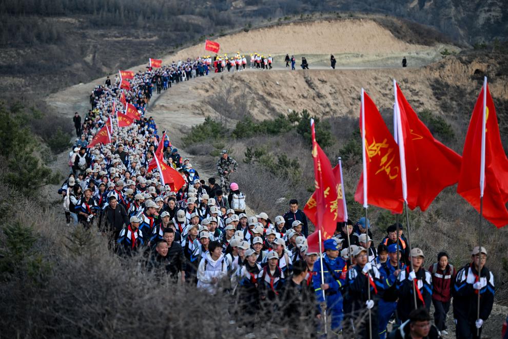 4月3日,參加徒步祭英烈活動的師生們翻越黃峁山。