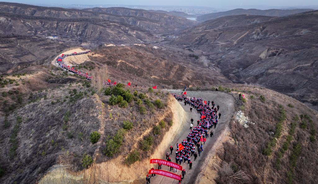 4月3日,參加徒步祭英烈活動的師生在翻越黃峁山(無人機(jī)照片)。