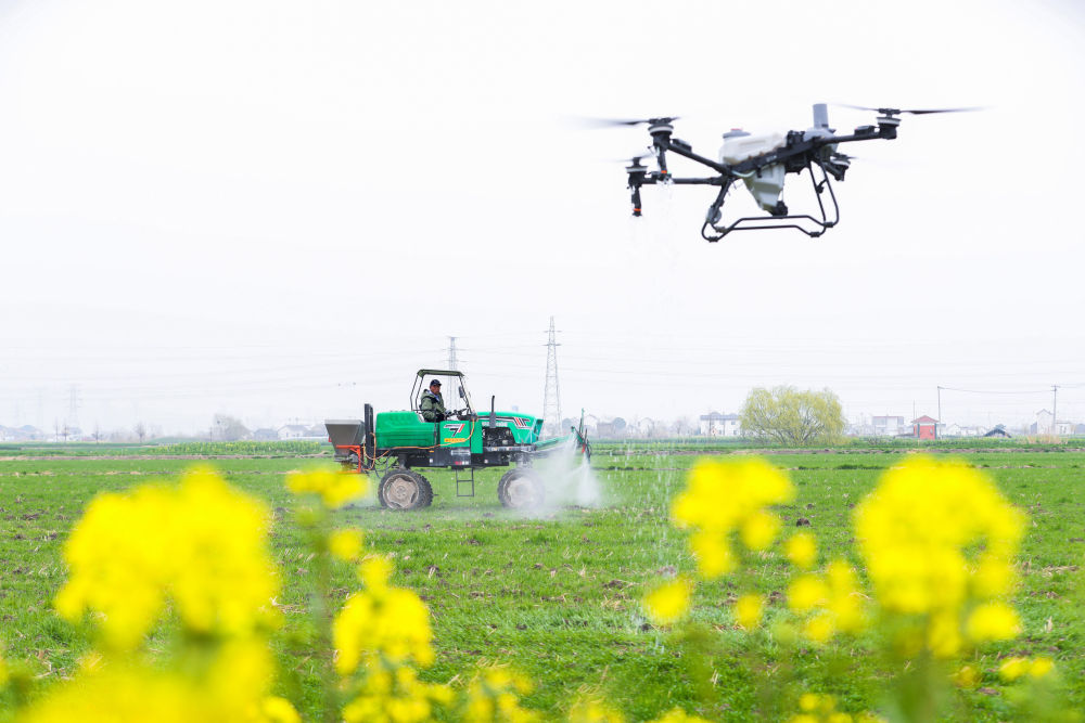 近日,在江蘇省興化市陳堡鎮(zhèn)蔣莊村,農(nóng)民駕駛植保無(wú)人機(jī)、自走式噴桿噴霧機(jī)實(shí)施雜草防治作業(yè)。 新華社發(fā)(周社根 攝)