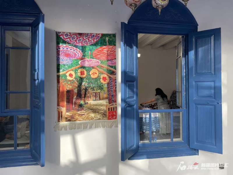 修舊如舊,喚醒了老街巷?,F(xiàn)在,這里有當(dāng)?shù)鼐用耖_的茶館和馕鋪,也有外地人經(jīng)營的咖啡館和旅拍店、服裝店。斑駁的土墻與雕花的木門間,墻上懸掛的各色瓷盤、托盤,無聲訴說著歲月的變遷。2024年,這里接待游客90萬人次,成為庫車市文旅新地標(biāo)。