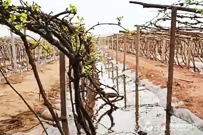 2022年,鄯善縣魯克沁鎮(zhèn)迪汗蘇村葡萄地在采用高效節(jié)水灌溉之前,大水漫灌的場景。熱杰甫·吐爾遜 攝