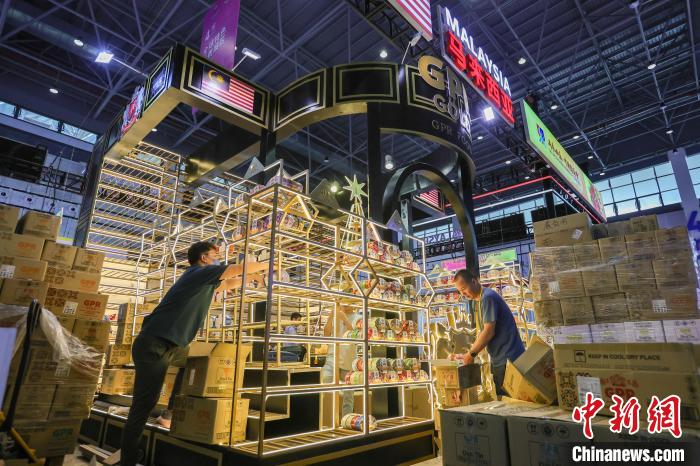 4月11日,第五屆中國國際消費(fèi)品博覽會即將開展,馬來西亞館的展商在布置展品。中新社記者 駱云飛 攝
