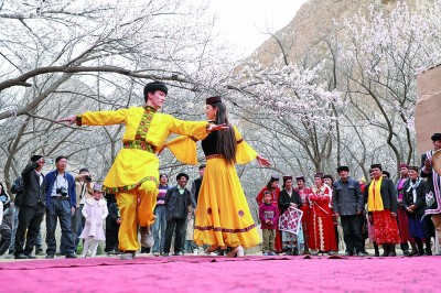 新疆阿克陶縣塔爾鄉(xiāng)民間藝人與游客在杏花樹(shù)下共舞。毛吾拉江·艾山江攝