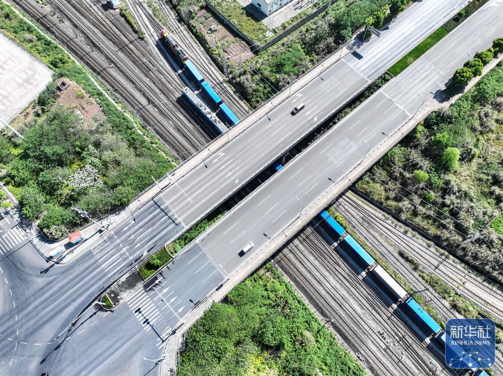 4月20日,圖定中亞班列在重慶團(tuán)結(jié)村中心站順利發(fā)車(無人機(jī)照片)。