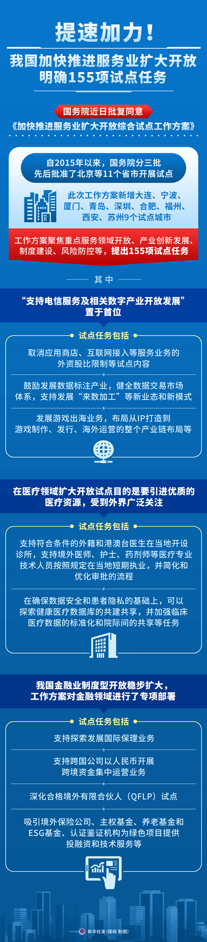 具體來(lái)看,工作方案聚焦重點(diǎn)服務(wù)領(lǐng)域開放、產(chǎn)業(yè)創(chuàng)新發(fā)展、制度建設(shè)、風(fēng)險(xiǎn)防控等,提出155項(xiàng)試點(diǎn)任務(wù)。