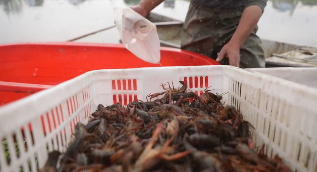 剛出水的小龍蝦被立即送往分揀中心,進行質(zhì)量檢驗和稱重分級。分揀線上,分揀工岳臘春戴著橡膠手套,指尖翻飛間完成了龍蝦的分級。岳臘春說,“我們是發(fā)月工資,一個月5000元,一天工作按貨的多少來定。”