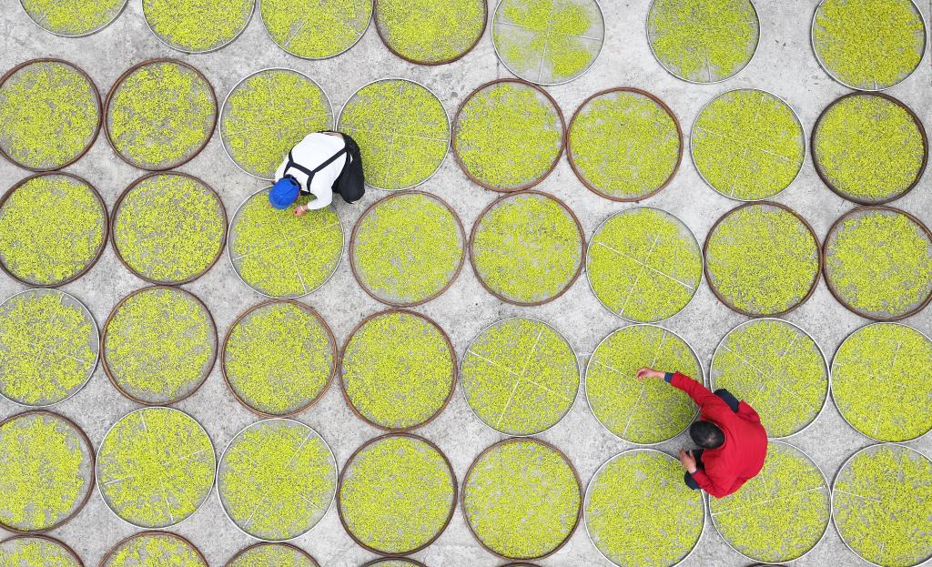 4月7日,在湖南省永州市雙牌縣上梧江瑤族鄉(xiāng)盤家村云臺山生態(tài)有機茶園,茶農(nóng)在攤曬春茶(無人機照片)。新華社發(fā)(何紅福攝)
