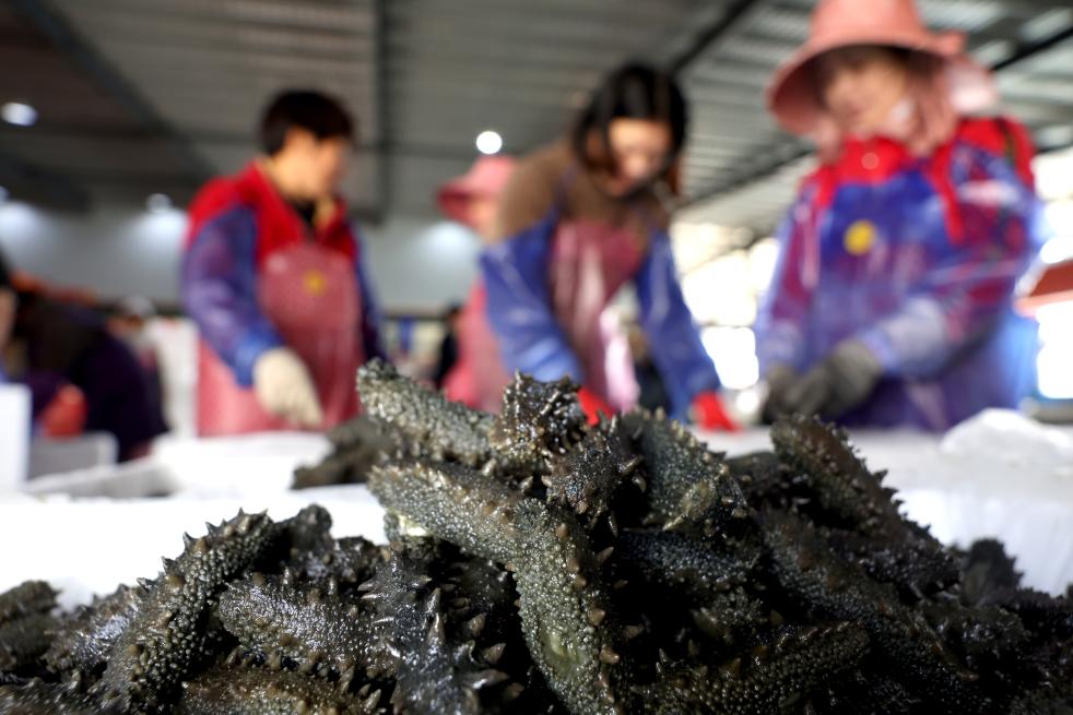 4月14日,在霞浦縣溪南鎮(zhèn)一家水產(chǎn)養(yǎng)殖企業(yè),工人在分揀、包裝海參。新華社發(fā)(王旺旺 攝)