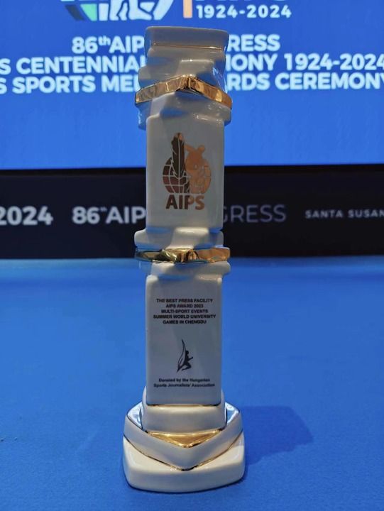 在2024年4月29日舉行的國際體育記者協(xié)會(huì)頒獎(jiǎng)典禮上,成都大運(yùn)會(huì)獲得2023年度綜合賽事最佳媒體設(shè)施服務(wù)獎(jiǎng)。新華社發(fā)