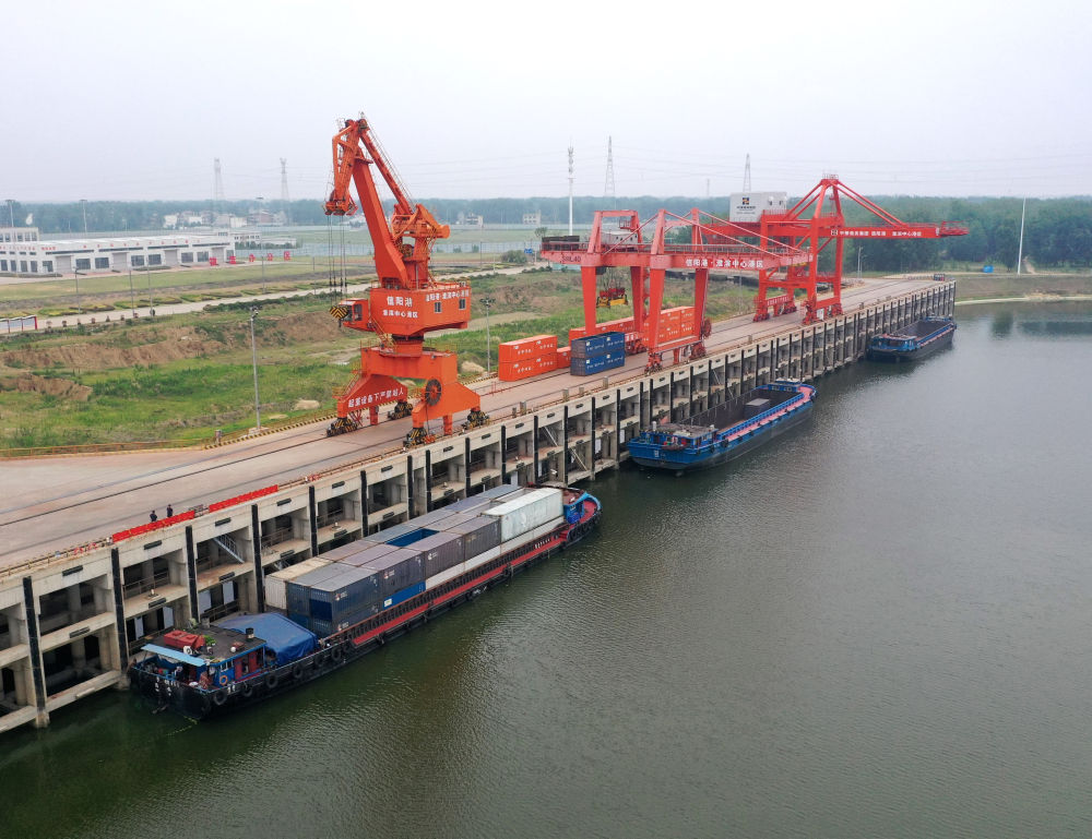 2024年6月5日,貨船停泊在信陽(yáng)港·淮濱中心港內(nèi)(無(wú)人機(jī)照片)。新華社記者 李嘉南 攝