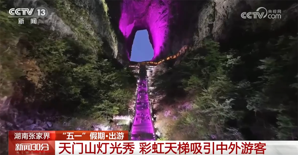 “五一”假期,湖南天門山景區(qū)以自然風光吸引中外游客。隨著夜幕降臨,天門山山體被五彩燈光點亮,999級彩虹臺階燈光流轉,遠看就像一道連通天地的彩虹橋,將千年奇觀天門洞裝點得更加巍峨壯觀。