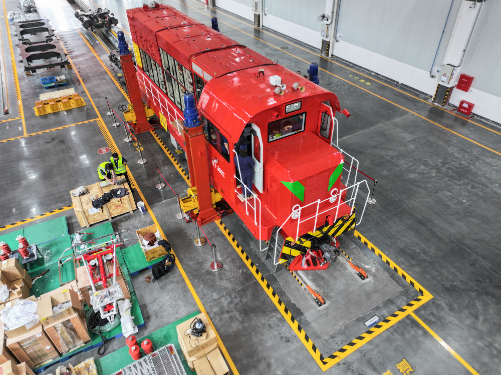 這是4月26日在湖南株洲聯(lián)誠集團控股股份有限公司新產業(yè)事業(yè)部車間拍攝的一臺準備改造成新能源的機車(無人機照片)。新華社記者 陳澤國 攝