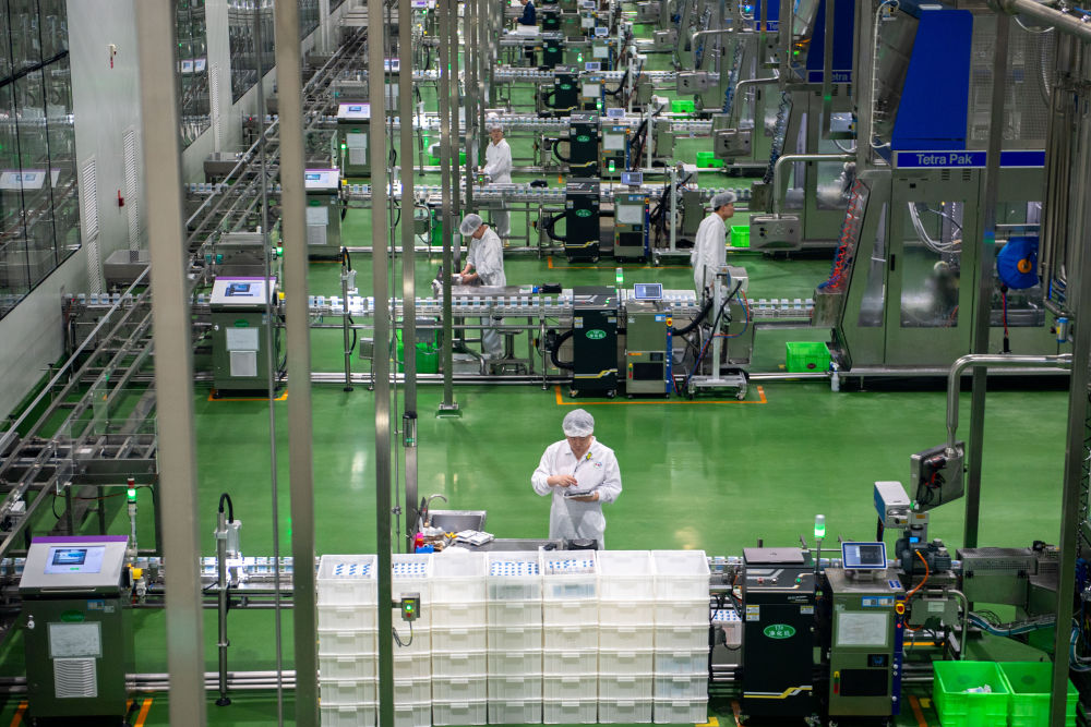 2025年4月17日,在內蒙古呼和浩特市土默特左旗,工人在伊利現(xiàn)代智慧健康谷全球智能制造產業(yè)園灌裝車間內工作。新華社發(fā)(李心逸攝)