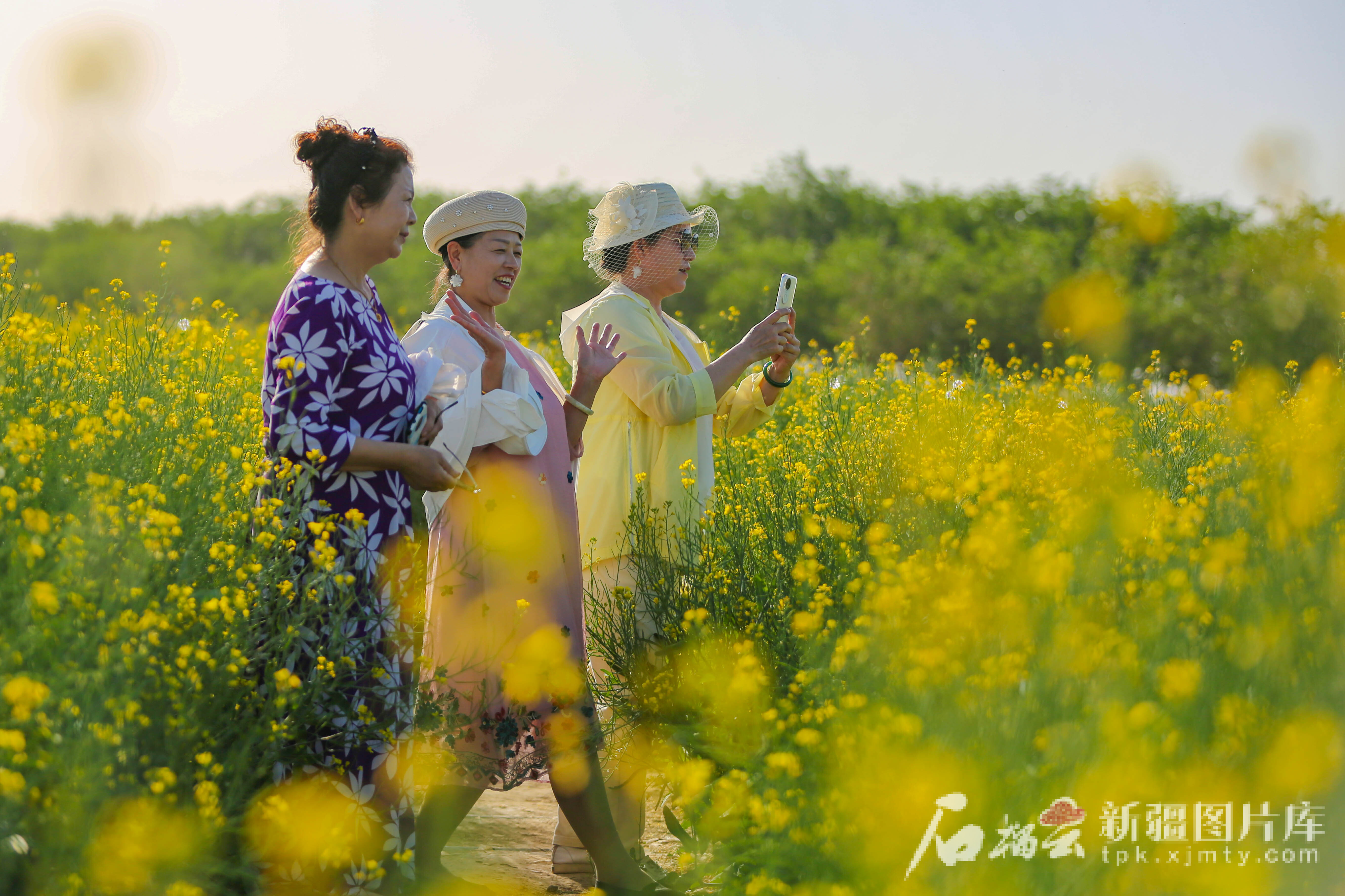 5月9日,游客在昌吉市六工鎮(zhèn)十三戶村千畝油菜花田景區(qū)游玩。