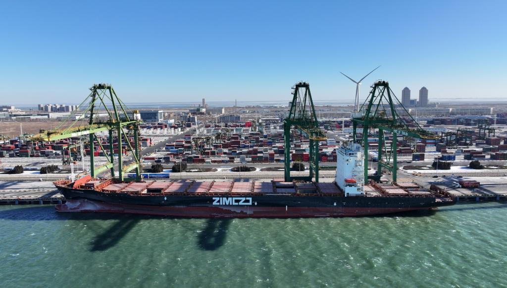2023年12月21日,“羅安達(dá)輪”集裝箱船靠泊在天津港(無(wú)人機(jī)照片)。當(dāng)日,“羅安達(dá)輪”集裝箱船正式從天津港出發(fā),駛向哥倫比亞、厄瓜多爾、秘魯、智利等南美洲國(guó)家,標(biāo)志著天津港正式開通天津—南美西新航線。新華社記者 趙子碩 攝