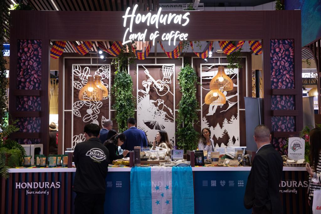 2023年11月6日,參觀者在第六屆進(jìn)博會(huì)國(guó)家展洪都拉斯展臺(tái)咨詢咖啡豆等展品信息。新華社記者 金立旺 攝