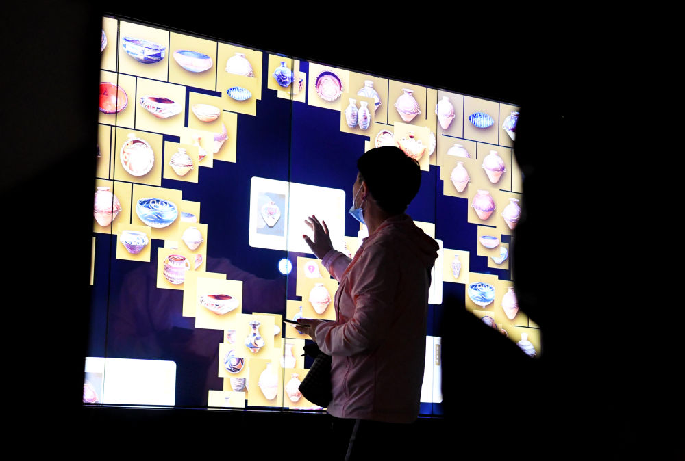 2024年9月24日,參觀者在河南仰韶文化博物館運用多點觸控技術(shù)了解文物。新華社記者 郝源 攝