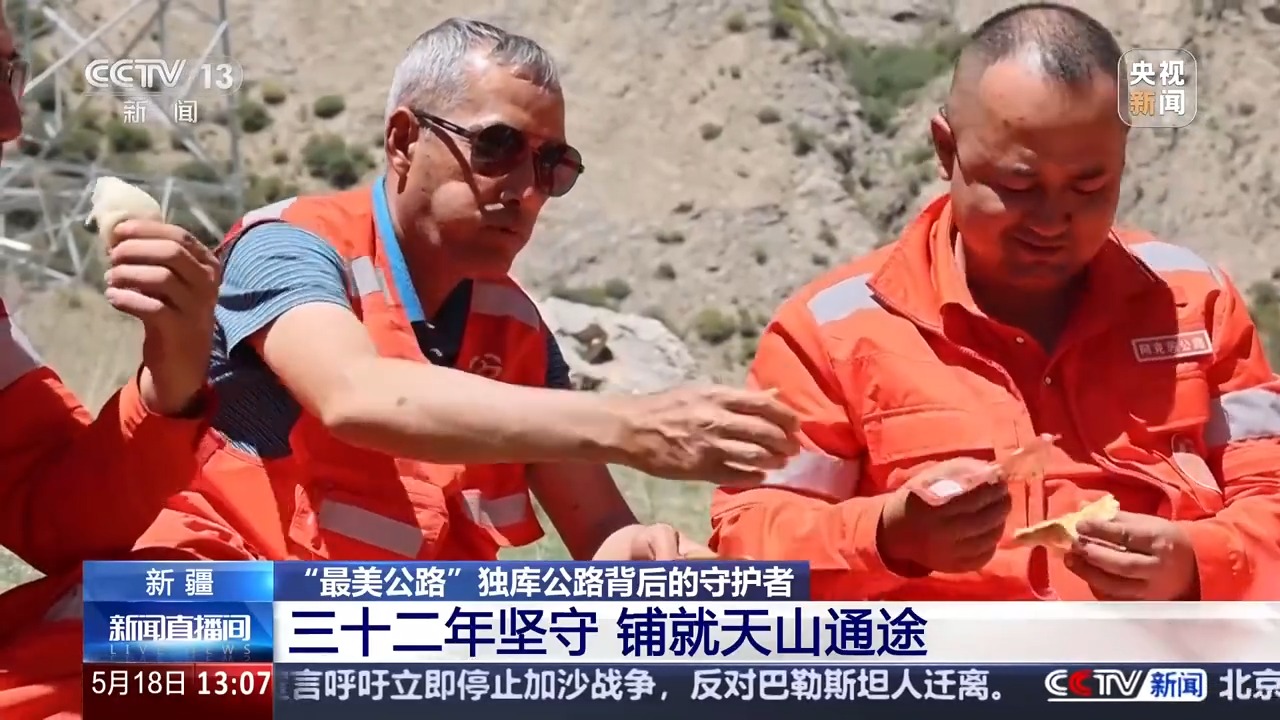 下午兩點多,亞克甫招呼大家停下來吃午飯。這幾天,亞克甫和同事們要搶在獨庫公路通車之前,把冰封了一個冬天的道路養(yǎng)護好。他們經常沒時間回到養(yǎng)護站休整,午飯也只能在路邊對付一下。