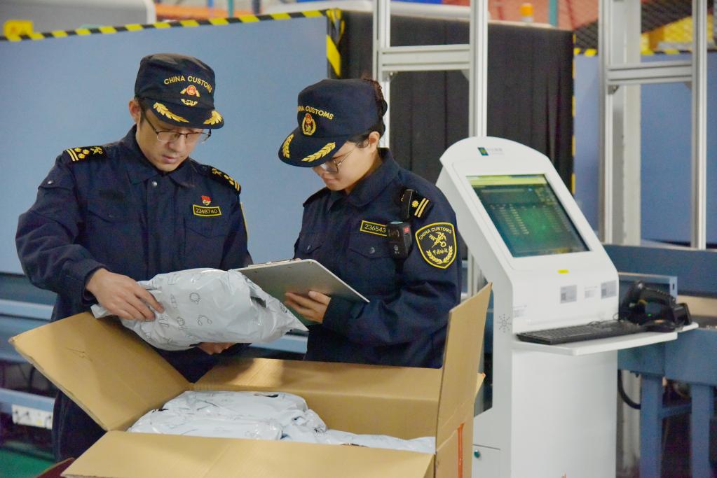 無錫海關(guān)關(guān)員對運往墨西哥的跨境電商商品進行查驗(2024年12月26日攝)。新華社發(fā)