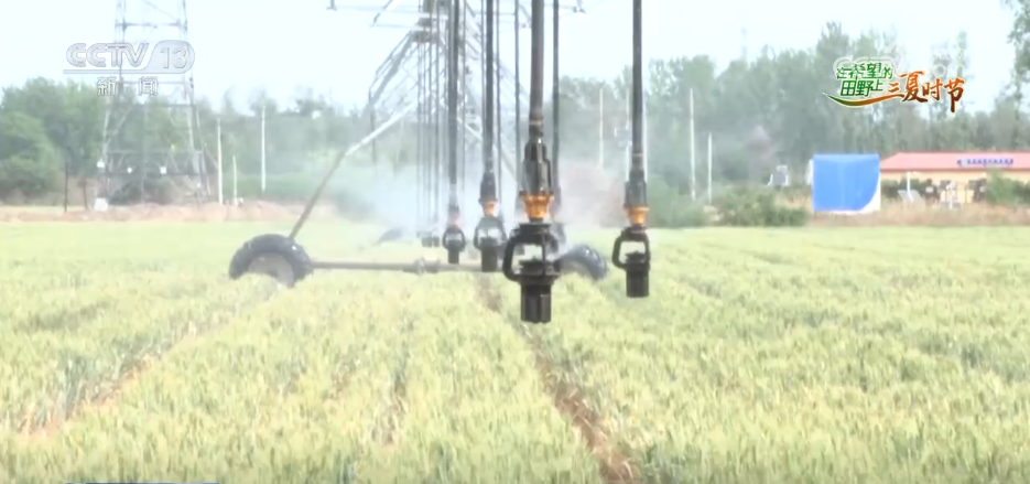 在侯馬市,大型自走式噴灌機(jī)沿著軌道勻速前行,精準(zhǔn)噴灑水霧,高效應(yīng)對干熱風(fēng)。