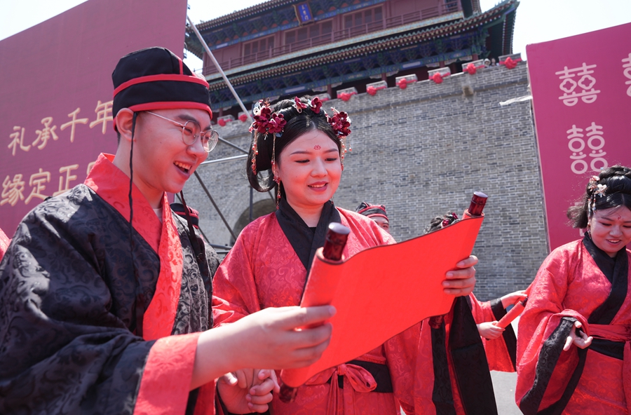 2025年5月17日,在河北省石家莊市正定古城舉行的集體婚禮上,一對新人在閱讀婚書。新華社發(fā)(梁子棟攝)