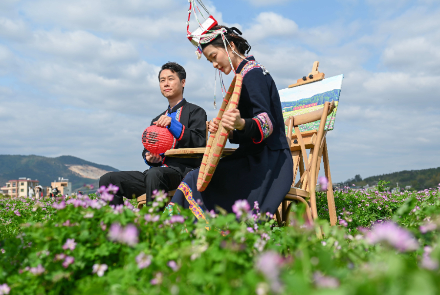 2025年3月16日,新人在廣東河源市東源縣柳城鎮(zhèn)的紫云英花海中婚拍留念。新華社記者 肖恩楠 攝