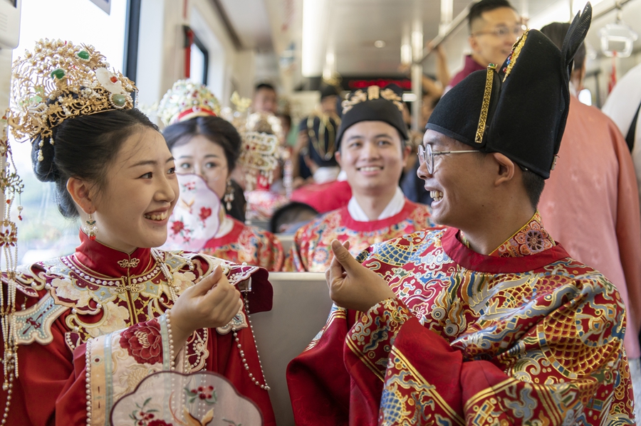 2024年8月10日,新人參加由浙江省金華市民政局與金華市軌道交通集團(tuán)有限公司聯(lián)合舉辦的“緣起金軌、愛在七夕”集體婚禮。新華社發(fā)(胡肖飛攝)
