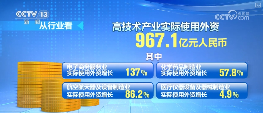 其中,電子商務(wù)服務(wù)業(yè)、航空航天器及設(shè)備制造業(yè)、化學(xué)藥品制造業(yè)、醫(yī)療儀器設(shè)備及器械制造業(yè)實際使用外資分別增長137%、86.2%、57.8%和4.9%。