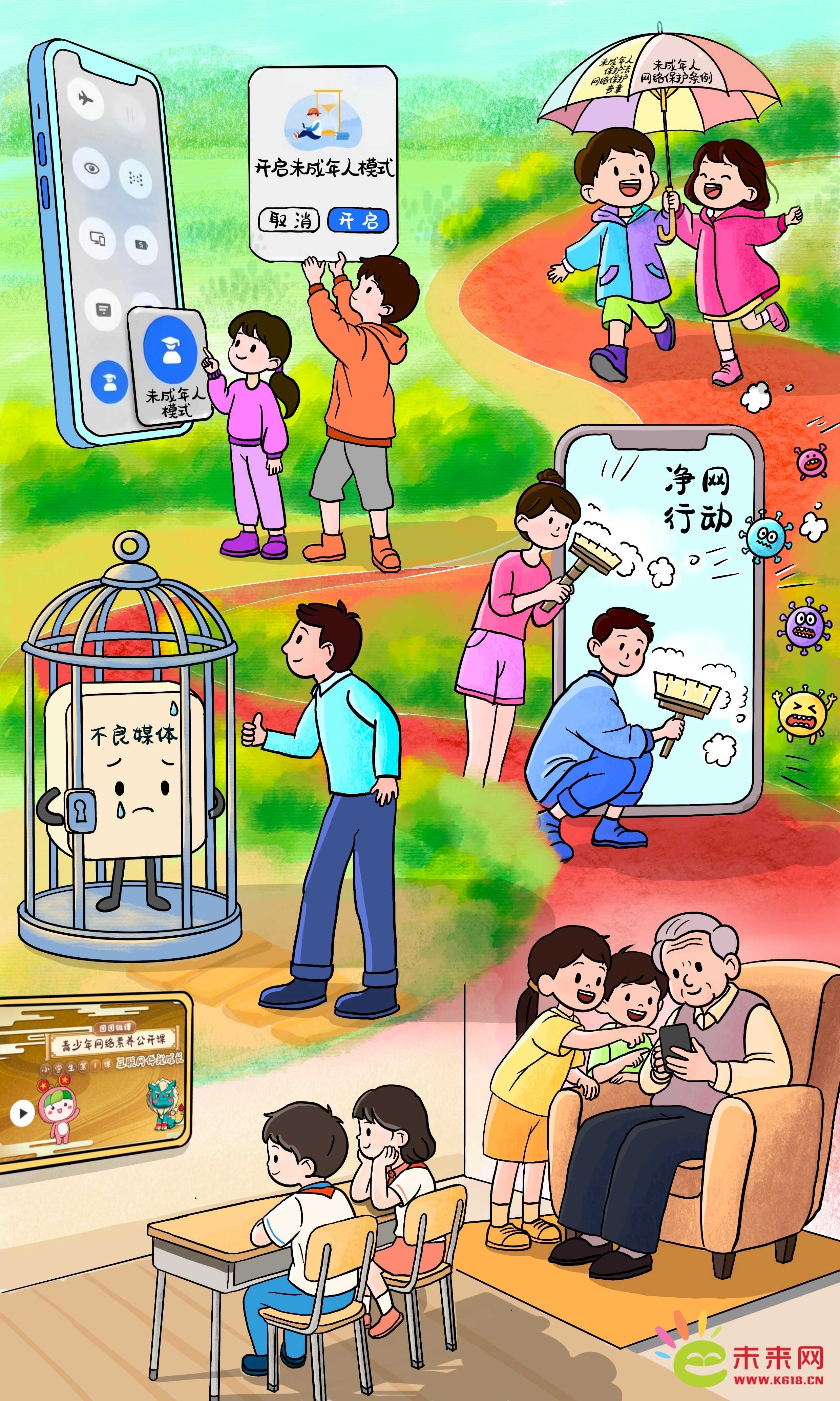 從新修訂的《中華人民共和國未成年人保護(hù)法》新增“網(wǎng)絡(luò)保護(hù)”專章,到《關(guān)于依法懲治網(wǎng)絡(luò)暴力違法犯罪的指導(dǎo)意見》《未成年人網(wǎng)絡(luò)保護(hù)條例》出臺,我國從立法、執(zhí)法、司法等多方面不斷織密未成年人用網(wǎng)的法治防護(hù)網(wǎng);中央網(wǎng)信辦持續(xù)開展“清朗”系列專項(xiàng)行動、發(fā)布《移動互聯(lián)網(wǎng)未成年人模式建設(shè)指南》,各地少先隊組織構(gòu)建貫穿各級少工委、聯(lián)動報刊網(wǎng)端微屏?xí)纳傧汝犎襟w矩陣,《團(tuán)團(tuán)微課:青少年網(wǎng)絡(luò)素養(yǎng)公開課》助力提升孩子們的網(wǎng)絡(luò)素養(yǎng)……全社會匯聚起守護(hù)清朗網(wǎng)絡(luò)環(huán)境的合力,廣大少年兒童也將成長為網(wǎng)絡(luò)文明的守護(hù)者、網(wǎng)絡(luò)強(qiáng)國建設(shè)的未來生力軍。