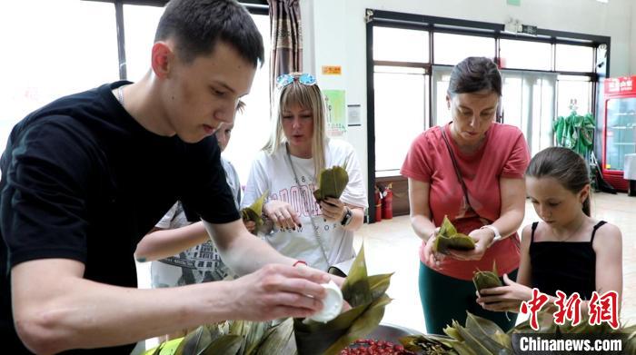 俄羅斯游客維拉興奮地說:“我們來到饒河,非常高興和大家一起包粽子,度過一個端午節(jié)。”