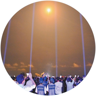 “5,4,3,2,1”——火箭的火焰照亮夜幕,平臺(tái)的光束射向天際……19時(shí)50分,火箭發(fā)射升空,游客們舉著手機(jī)記錄,現(xiàn)場(chǎng)歡呼聲陣陣?!昂芘d奮、很震撼,感覺一伸手就能‘抓’到火箭?!毖逾暦普f。