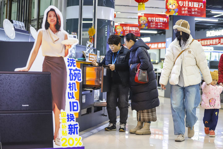 2025年1月8日,顧客在山東省青島市李滄區(qū)李村街道一家商場(chǎng)選購洗碗機(jī)。新華社發(fā)(張鷹 攝)
