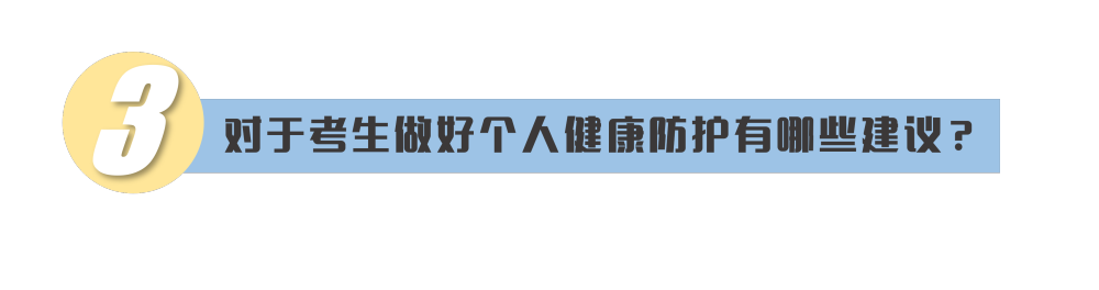 考生要做好個人防護(hù),當(dāng)好自身健康第一責(zé)任人??记氨M量減少聚集和流動,不去人員密集場所。同時,調(diào)整好心理狀態(tài),保證合理的飲食、充足的睡眠、適當(dāng)?shù)纳眢w鍛煉,如有不適,要及時就醫(yī)治療,謹(jǐn)防因身體不適而影響考試。對于發(fā)熱或者突發(fā)急病等考生,也不必?fù)?dān)心恐慌,各地考點都制定了相應(yīng)的預(yù)案。